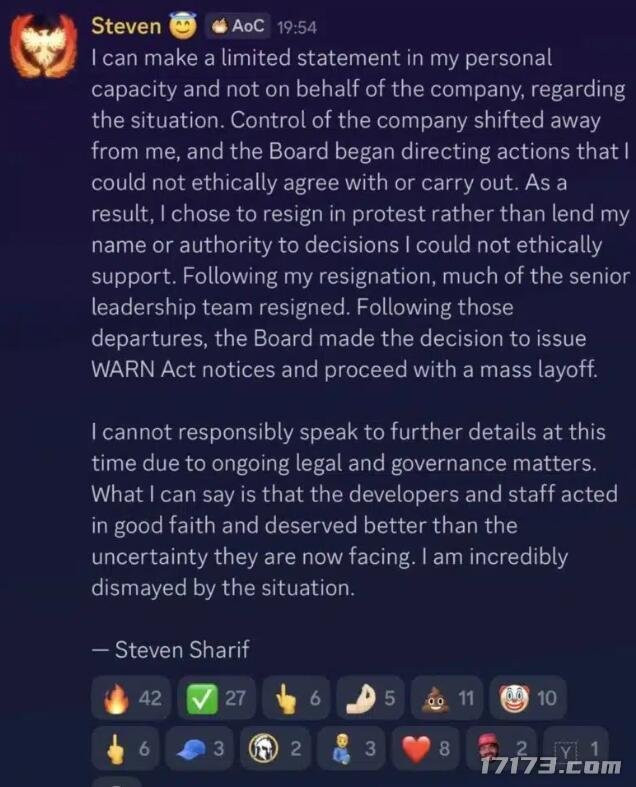 就当大家以为很快就等到《创世灰烬》公测了,没想到等到的却是云服务起诉Intrepid Studios拖欠85.2万美元费用的官司,当时Sharif还嘴硬的表示问题不严重,没想到,转头Sharif就辞职了, Intrepid Studios也宣布倒闭了。